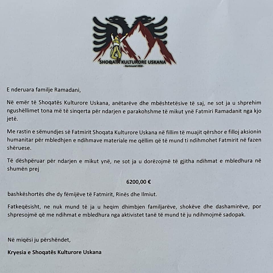 Shoqata Kulturore Uskana i shpreh familjes Ramadani ngushëllimet të sinqerta. Allahu e mëshiroft Fatmirin me xhenet kurse familjes së tij Allahu ja e shtoft durimin dhe forcen në këto ditë të hidhura.